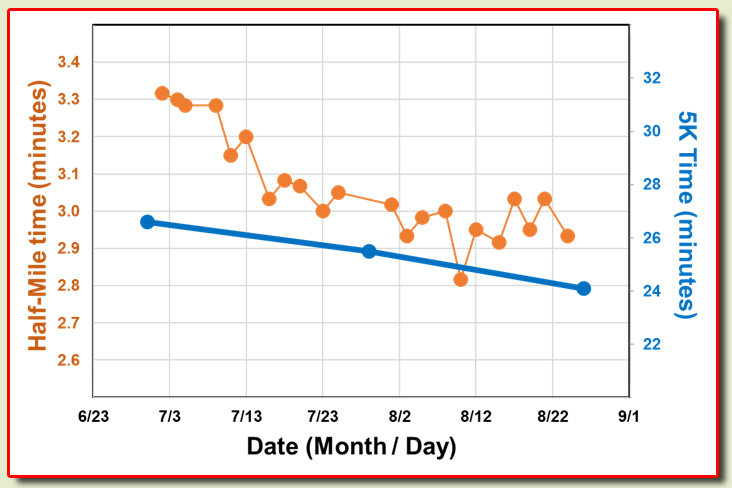Materials and Methods: Needed for this experiment was a stop watch and a pair of running shoes. Initially, a distance of 3.1 miles (5 kilometers) through the neighborhood was mapped out and then ran to establish a baseline. Then every 1-3 days depending on how ScientificAMeriKen (at age 47) was feeling, a run around the neighborhood block was run (approximately 0.52 miles)with the goal of trying to beat the previous time. In theory, the better one does, the shorter time this exercise takes. There was no warm-up or stretch before each run, although initial pace for each half-mile run started at a slower pace. 5 kilometer race time was then reassessed approximately every 4 weeks.
